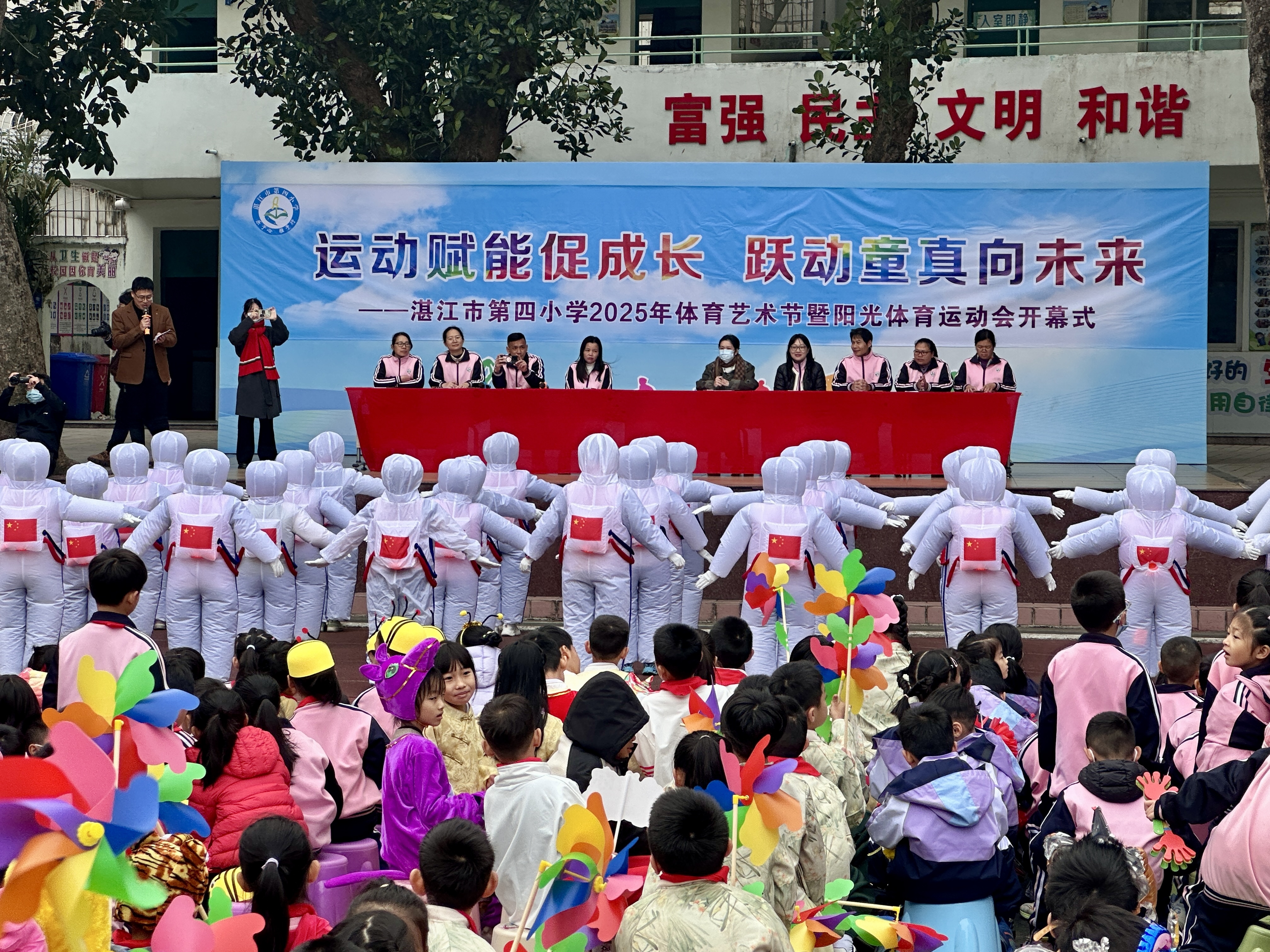 乘着第十五届全国运动会成功举办的东风,响应“激情全运会,活力大湾区”的广泛号召,12月26日,湛江市第四小学举办体育艺术节暨阳光体育运动会开幕式。这场以“运动赋能促成长 跃动童真向未来”为主题的体育盛会,不仅是少年们速度与力量的角逐,更是全运精神在校园土壤里的深度扎根与生动诠释。