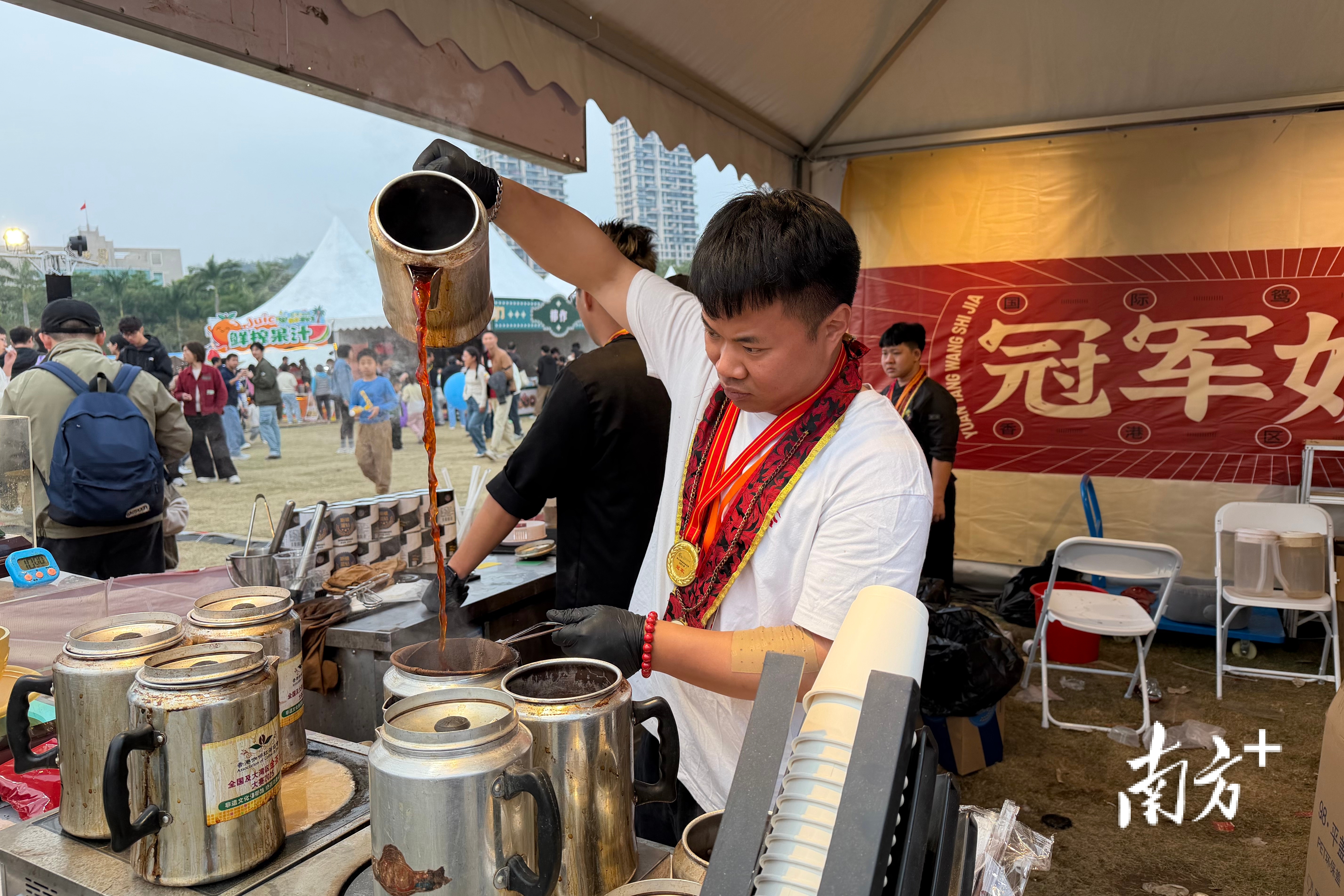 要说现场最“凡尔赛”的摊位,非香港鸳鸯王“掂档”莫属。摊位上摆满金光闪闪的丝袜奶茶大赛冠军奖杯,创始人钟先生更是直接把夺冠的师傅请到现场坐镇。“尝尝我们的冠军奶茶!正宗的港式风味。”他表示,“我们在珠海的门店刚开业不久,就是希望大家在家门口就能喝到最地道的港式奶茶。”