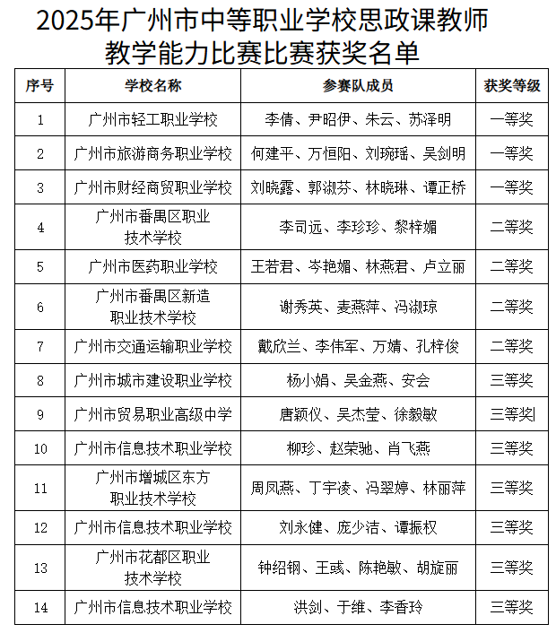 1、中等职业学校班主任业务能力大赛获奖教师(可多选) 陈泓宇 广州市纺织服装职业学校 一等奖 曾婷婷 广州市交通运输职业学校 一等奖 朱莹 广州市轻工职业学校 一等奖 孙晋 广州市财经商贸职业学校 二等奖 李冬霞 广州市财经商贸职业学校 二等奖 郑筠 广州市旅游商务职业学校 二等奖 孟柳樊 广州市增城区职业技术学校 二等奖 夏叶丹 广州市增城区东方职业技术学校 二等奖 2、中等职业学校思政课教师教学能力比赛获奖队伍 广州市轻工职业学校 李倩、尹昭伊、朱云、苏泽明 一等奖 广州市旅游商务职业学校 何建平、万恒阳、刘琬瑶、吴剑明 一等奖 广州市财经商贸职业学校 刘晓露、郭淑芬、林晓琳、谭正桥 一等奖 广州市番禺区职业技术学校 李司远、李珍珍、黎梓媚 二等奖 广州市医药职业学校 王若君、岑艳媚、林燕君、卢立丽 二等奖 广州市番禺区新造职业技术学校 谢秀英、麦燕萍、冯淑琼 二等奖 广州市交通运输职业学校 戴欣兰、李伟军、万婧、孔梓俊 二等奖 提交