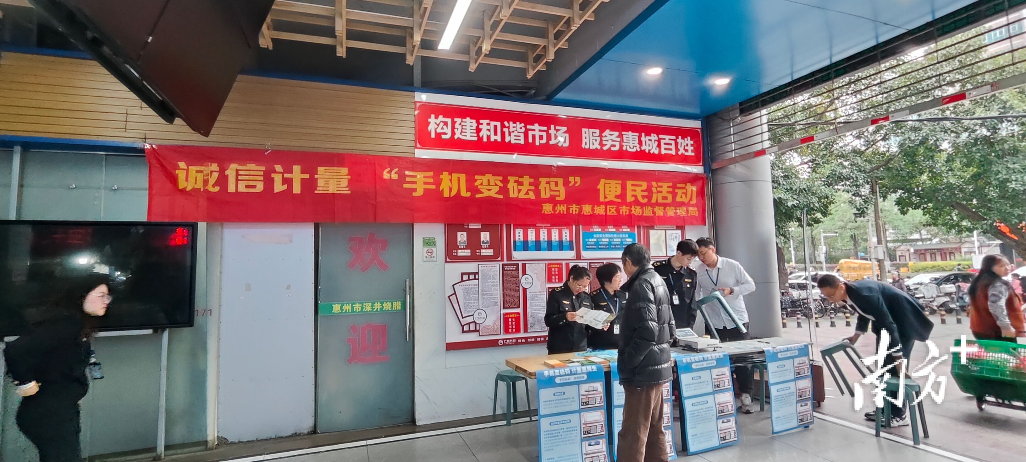 12月20日,一场主题为“手机变砝码 计量惠民生”的诚信计量便民活动在惠城区河南岸中心市场举行。工作人员现场为消费者手机称重贴标,随身携带的手机巧变计量砝码,消费者都成为市场公平“监督员”,切实让“鬼秤”等市场缺斤少两行为无处遁形。