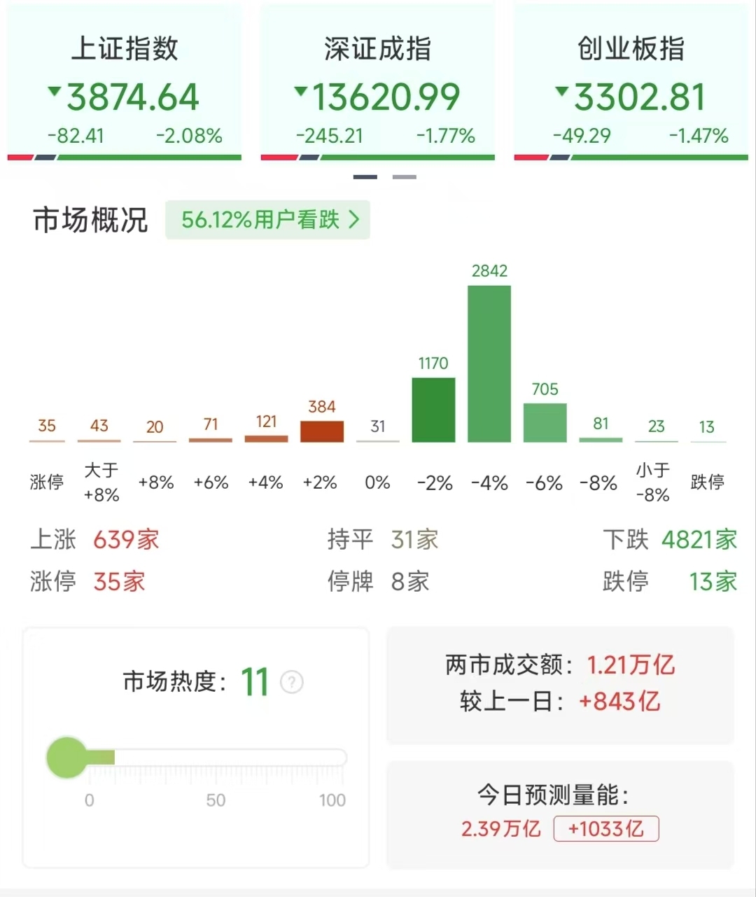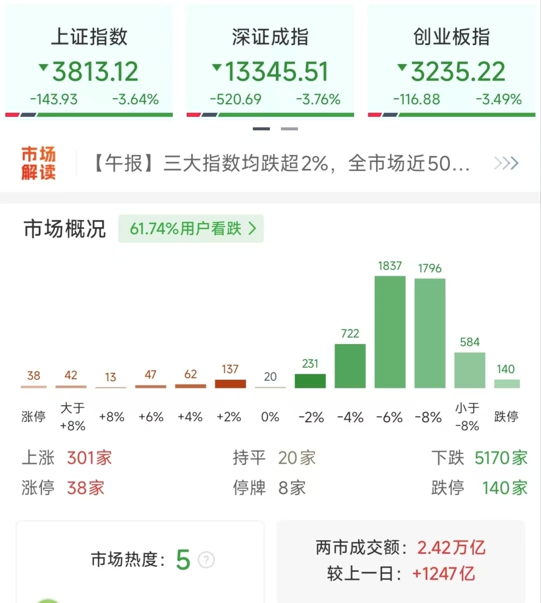 3月23日,A股全线大跌,市场呈现极端普跌行情。截至收盘,上证指数收报3813.28点,大跌3.63%,盘中一度跌破3800点,再创近一年新低;深证成指、创业板指同步大幅走弱,跌幅分别是3.76%和3.49%。
