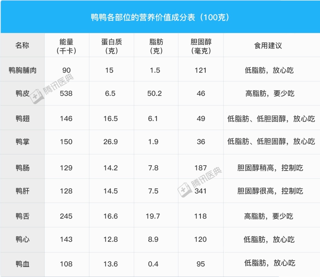 从营养的角度分析,鸭皮、鸭舌脂肪含量比较多,鸭肝、鸭肠中胆固醇含量比较高。如果想减肥或者有“三高”,建议少吃或者不要吃这四个部位。