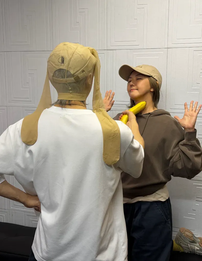 照片中,周星驰复刻了自己的“经典”银幕形象,以“丝袜”套头蒙面,手拿香蕉抵住孙燕姿的脖子,孙燕姿则配合地做投降状。