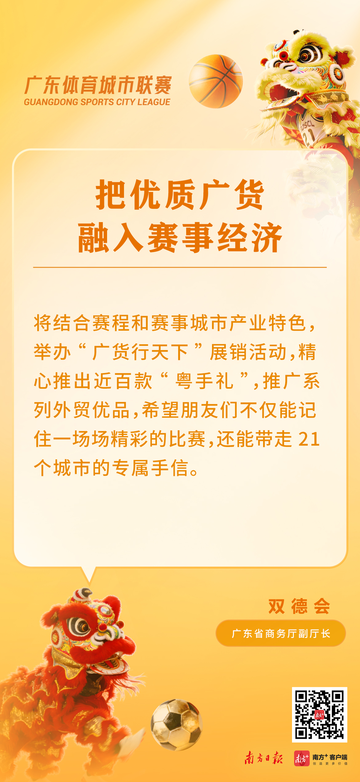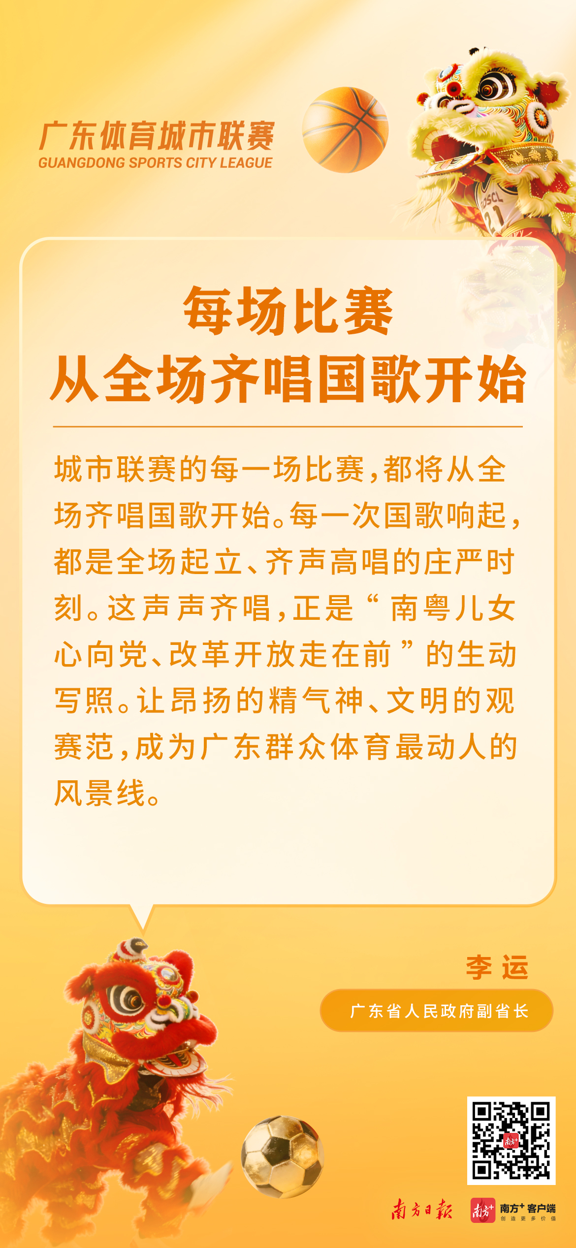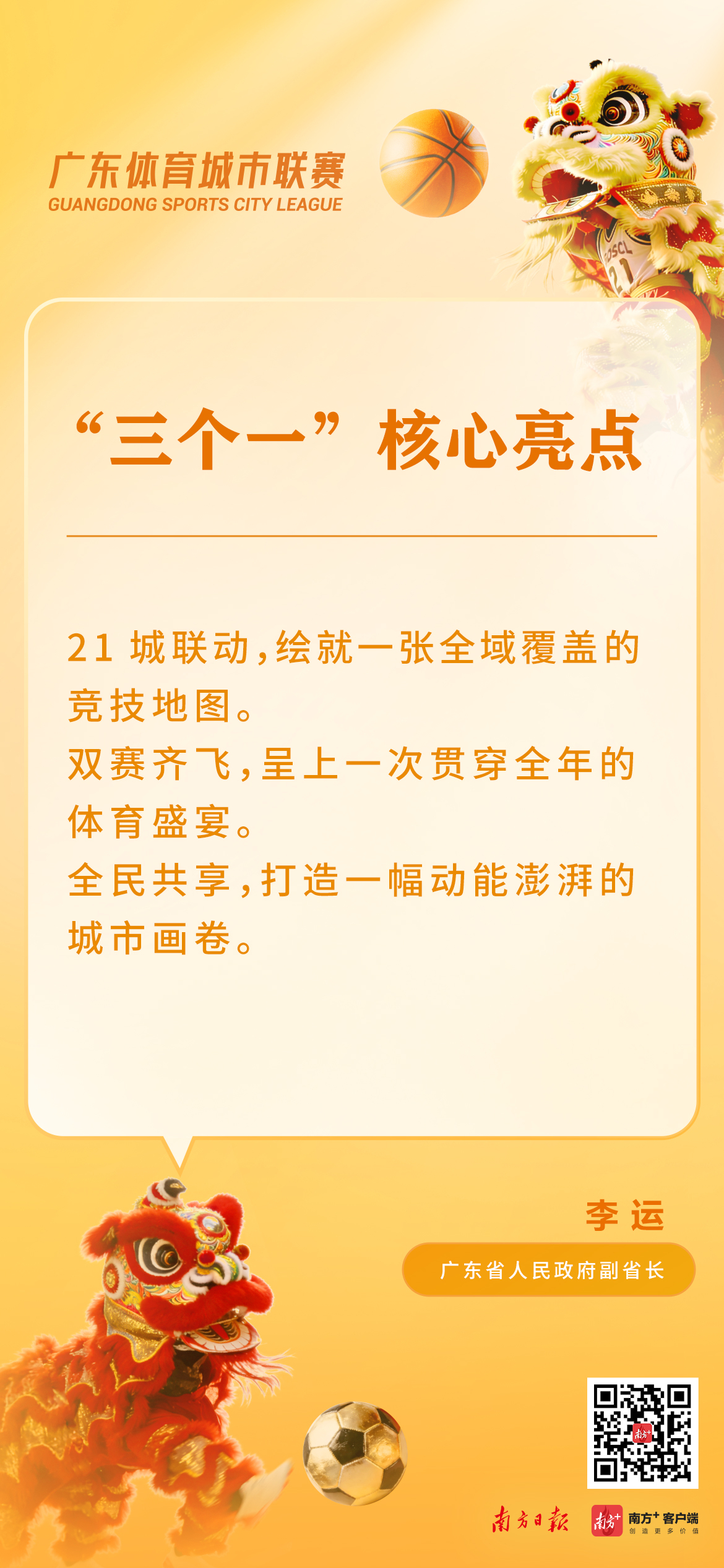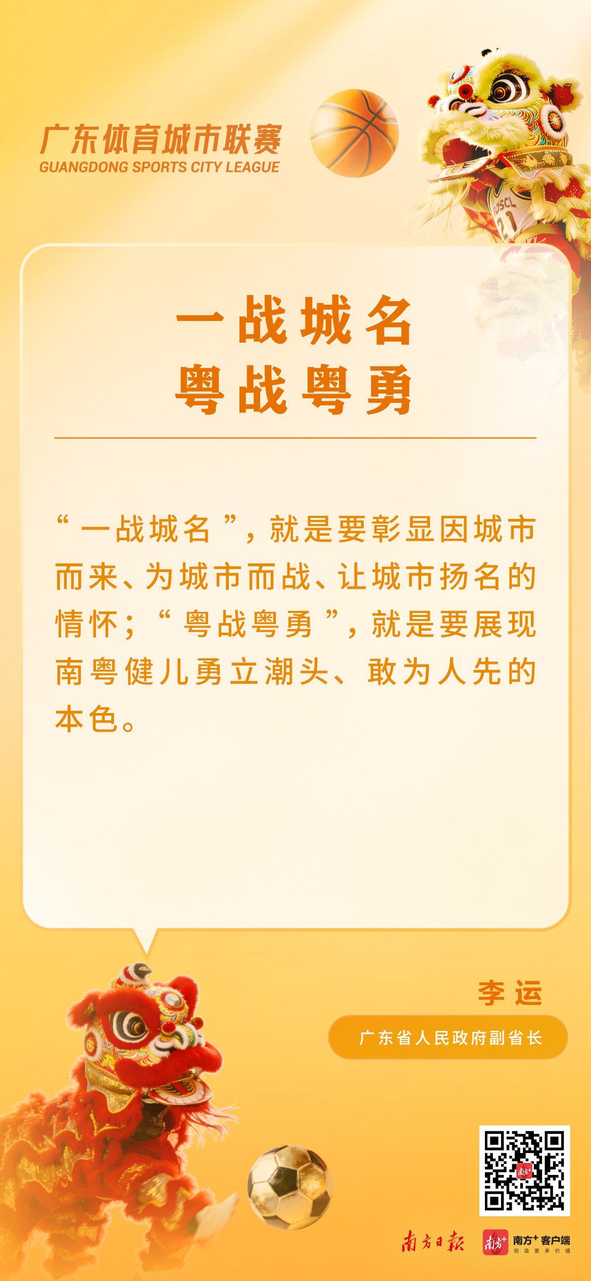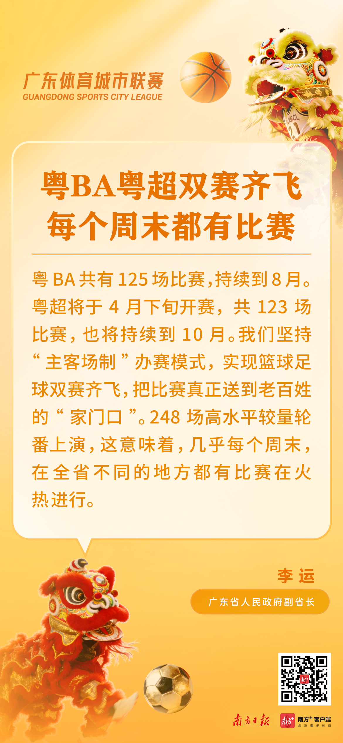 一战城名,粤战粤勇。3月14日上午,广东体育城市联赛新闻发布会在广州召开,正式发布两项重大体育赛事,包括2026年广东省城市篮球联赛(粤BA)和广东省城市足球超级联赛(粤超)。粤BA和粤超分别于3月21日和4月下旬激情开赛,广州队将坐镇天河体育中心,与中山队打响粤BA揭幕战。