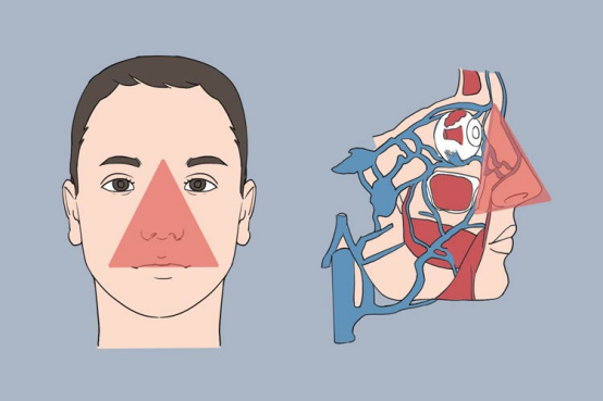 人的眼睛、鼻子和嘴巴之间存在一处“危险三角区”。这里血管密集、复杂,感染性病原体(如细菌)若从此区域扩散,有可能通过血管进入颅内。