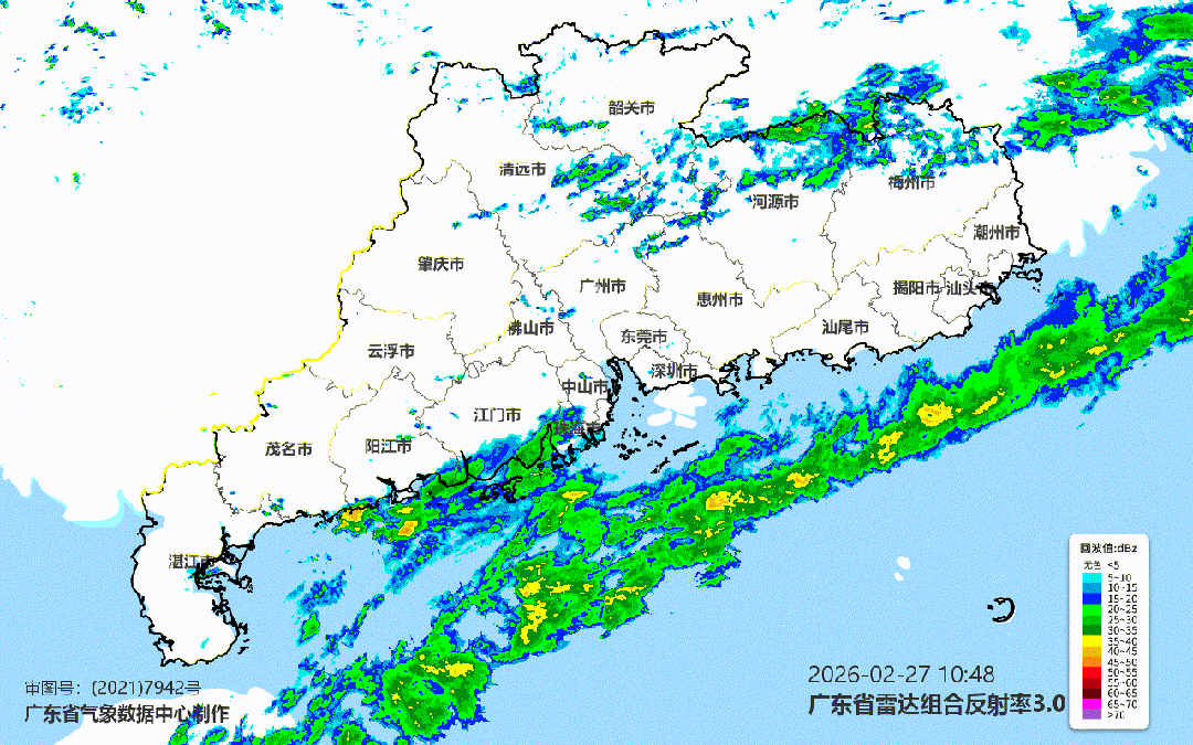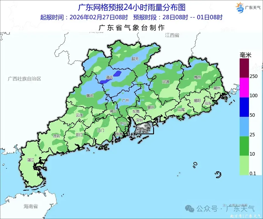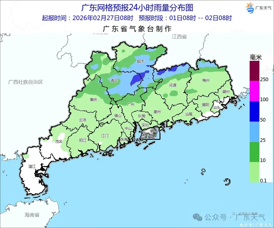 昨天白天到今天(27日)早晨,韶关中北部、清远中北部、肇庆北部、河源北部、梅州北部出现了中到大雨局部暴雨,伴有春雷,其余市县降雨不明显,以分散小雨为主。