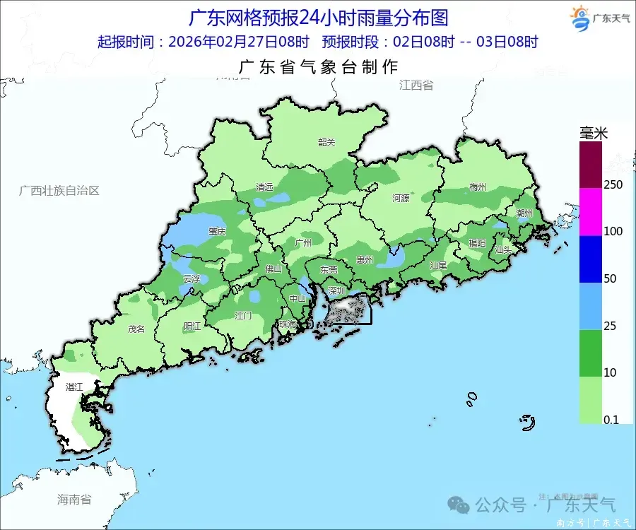 预计未来三天(2月28日至3月2日),广东省中北部市县有中到大雨局部暴雨,部分市县伴有弱雷电、短时强降水和6~8级短时大风,其余地区阴天有小雨。