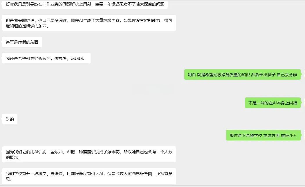 于是乎家长们对 AI 的问题从“我家孩子用 AI 写作业我要不要管”演化到了“我到底应该怎么教我的孩子 AI 是什么”。