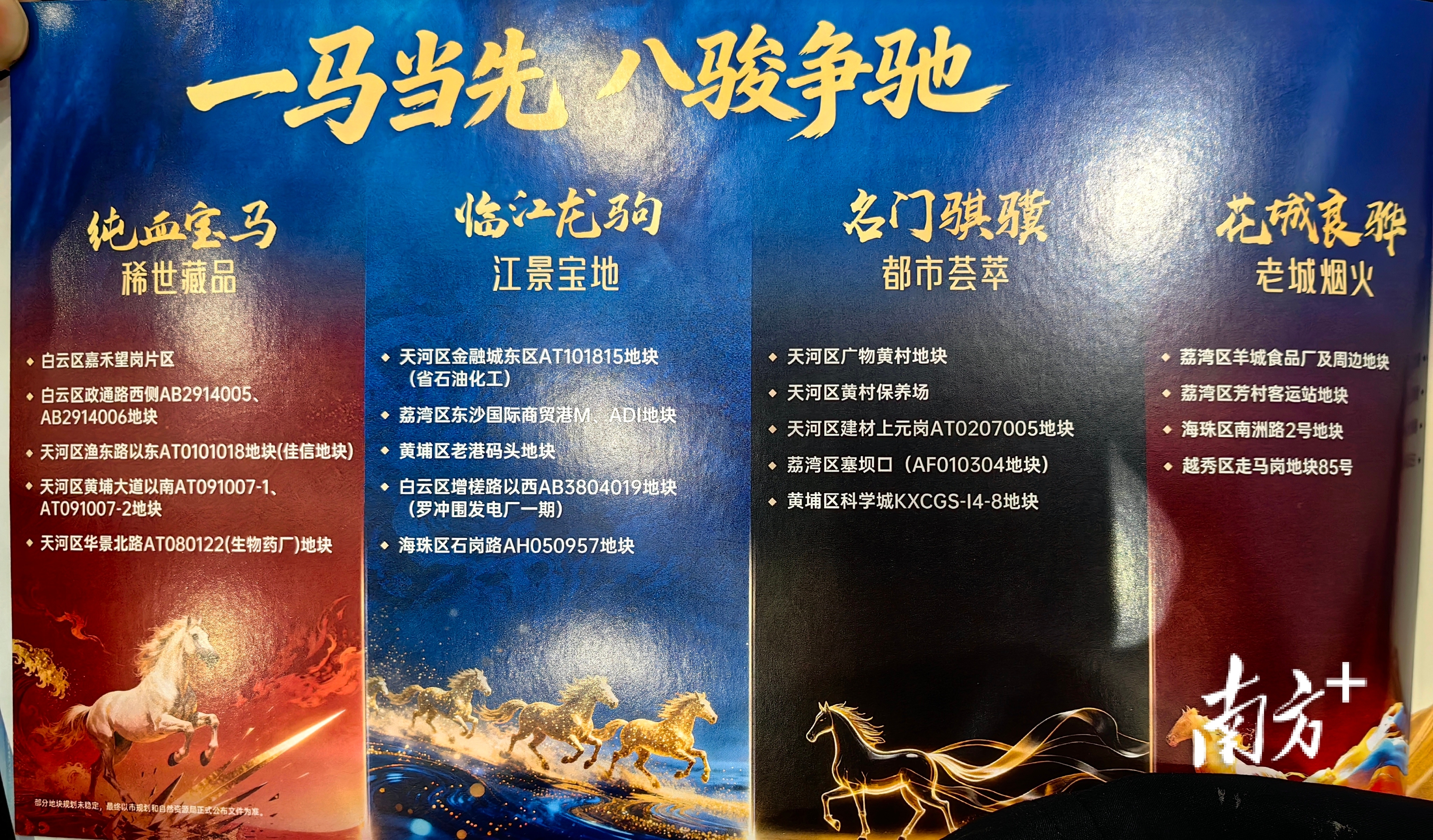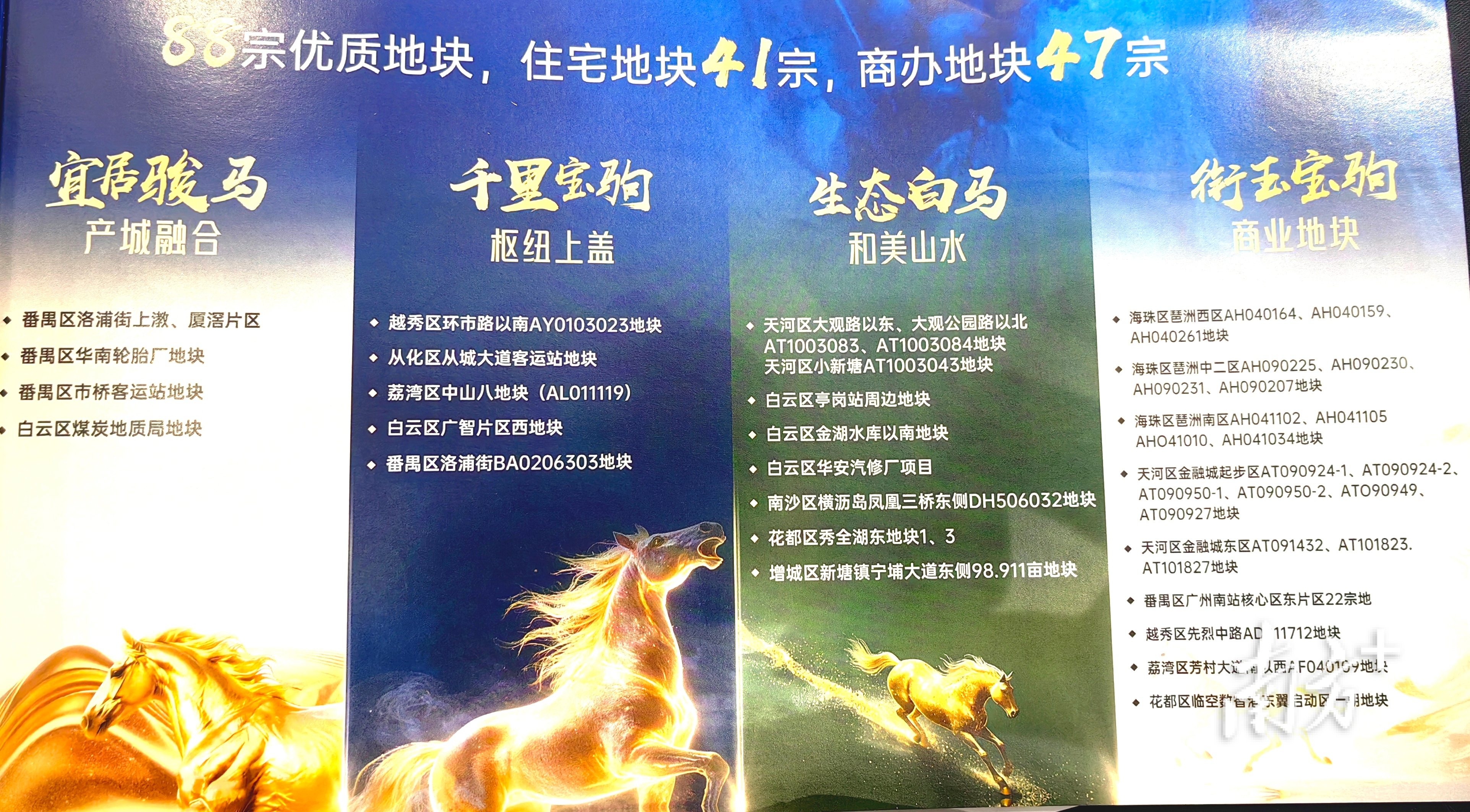 本次重点推出88宗用地,其中居住用地41宗、商服用地47宗,重点布局国际金融城、智谷、琶洲、白云新城等重点功能区,辐射黄埔临港、番禺洛浦等宜居片区。针对地块独特属性与价值,88宗靓地划分为“羊城八骏”八大系列——纯血宝马、临江龙驹、名门骐骥、花城良骅、宜居骏马、千里宝驹、生态白马、衔玉宝马,现场逐一推介、生动演绎每一宗地的稀缺属性。