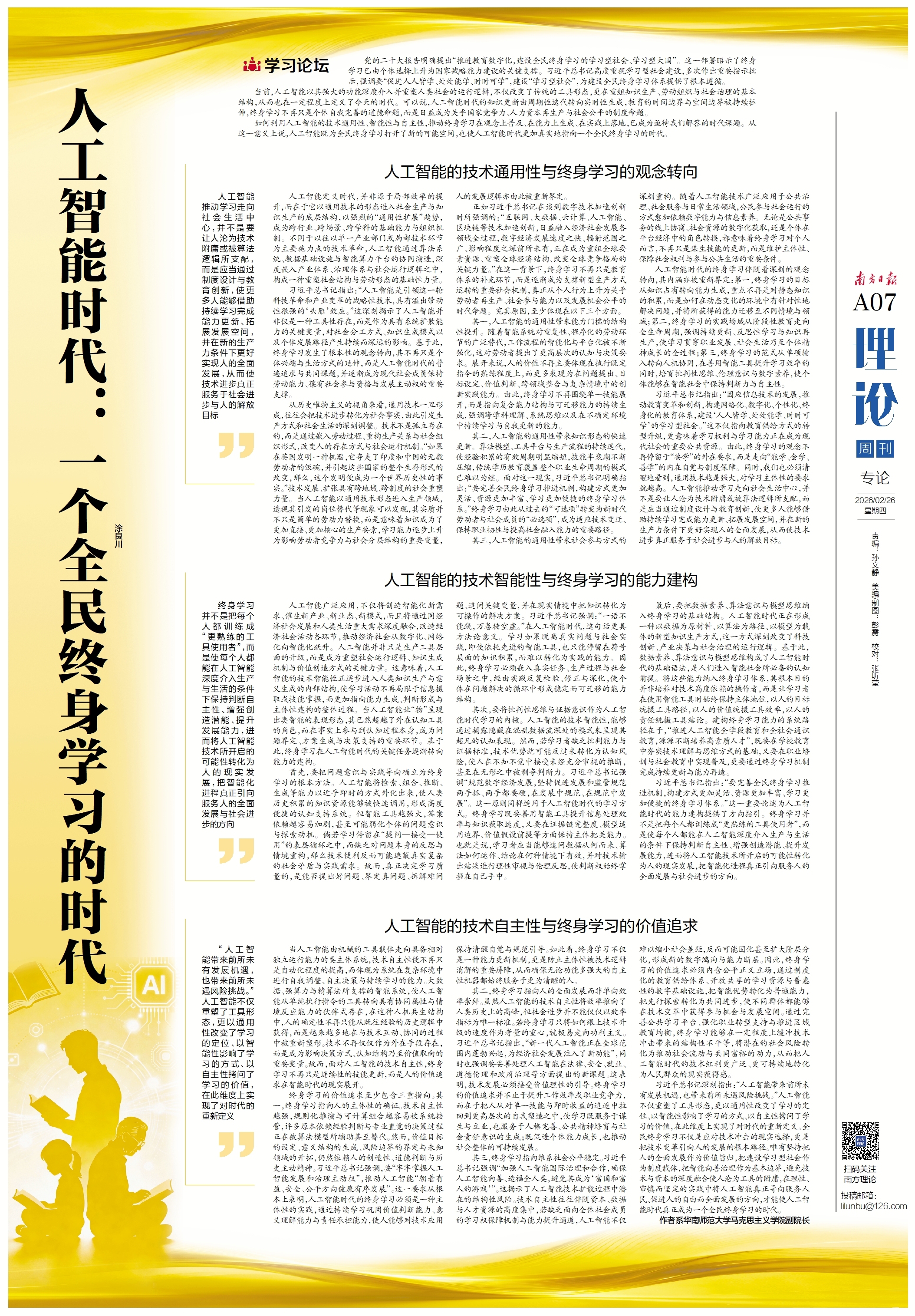 习近平总书记深刻指出:“人工智能带来前所未有发展机遇,也带来前所未遇风险挑战。”人工智能不仅重塑了工具形态,更以通用性改变了学习的定位、以智能性影响了学习的方式、以自主性拷问了学习的价值,在此维度上实现了对时代的重新定义。全民终身学习不仅是应对技术冲击的现实选择,更是把技术变革引向人的发展的根本路径。唯有坚持把人的全面发展作为价值旨归,把建设学习型社会作为制度载体,把智能向善治理作为基本边界,避免技术与资本的深度融合使人沦为工具的附庸,在理性、审慎而坚定的实践中将人工智能真正导向服务人民、促进人的自由而全面发展的方向,才能使人工智能时代真正成为一个全民终身学习的时代。