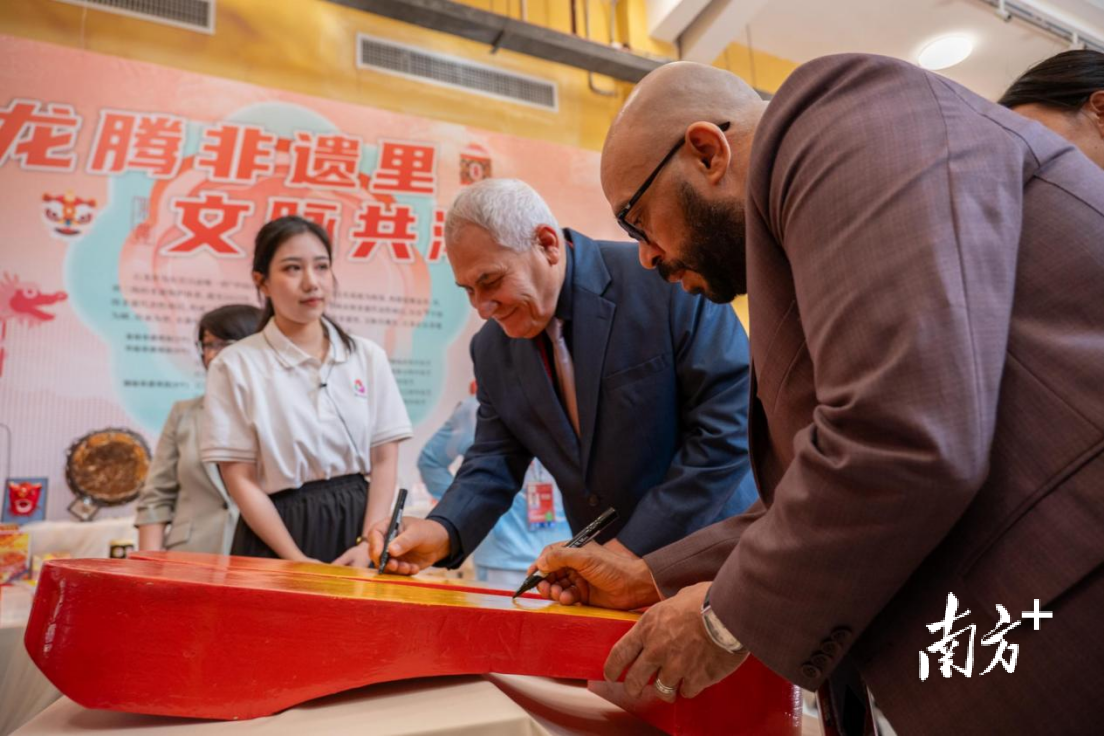 仪式后,国际举联代表们还在石龙的“市级非遗名片”——红漆描花传统木屐上签名留念。