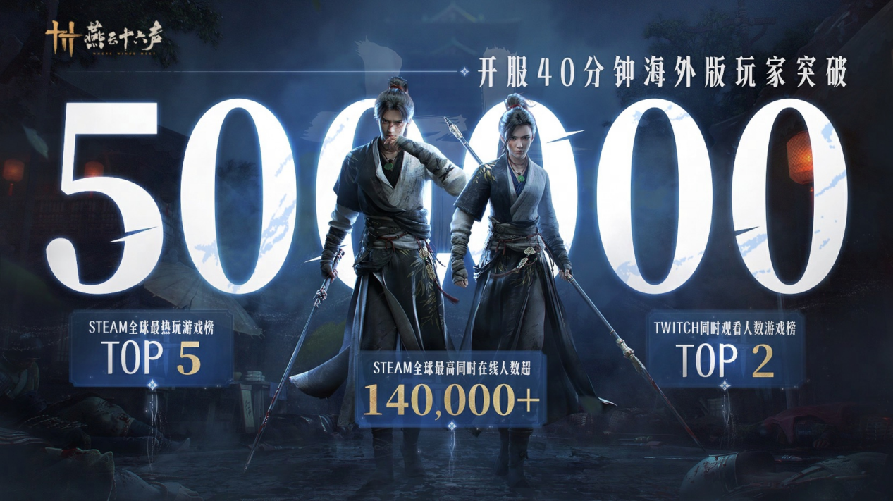 日前,网易旗下武侠开放世界游戏《燕云十六声》(英文名:Where Winds Meet)全球发行,登陆Steam、PlayStation、Epic平台。上线40分钟海外版玩家突破50万,并登上Steam全球最热玩游戏榜Top5,Steam全球最高同时在线人数超14万,Twitch同时观看人数游戏榜Top2,展现中国文化产品的全球吸引力。