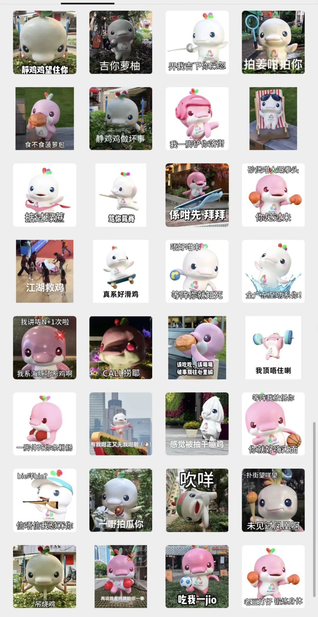 吉祥物的呆萌表情加上粤语文化的幽默buff,不但拉近了吉祥物和观众的距离,还意外地特别适配工作生活的种种场景。有网友调侃,“没有一个吉祥物表情包解决不了的社交场景——如果有,就再发一个”。