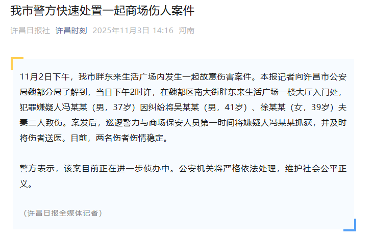 记者向许昌市公安局魏都分局了解到,当日下午2时许,在魏都区南大街胖东来生活广场一楼大厅入门处,犯罪嫌疑人冯某某(男,37岁)因纠纷将吴某某(男,41岁)、徐某某(女,39岁)夫妻二人致伤。