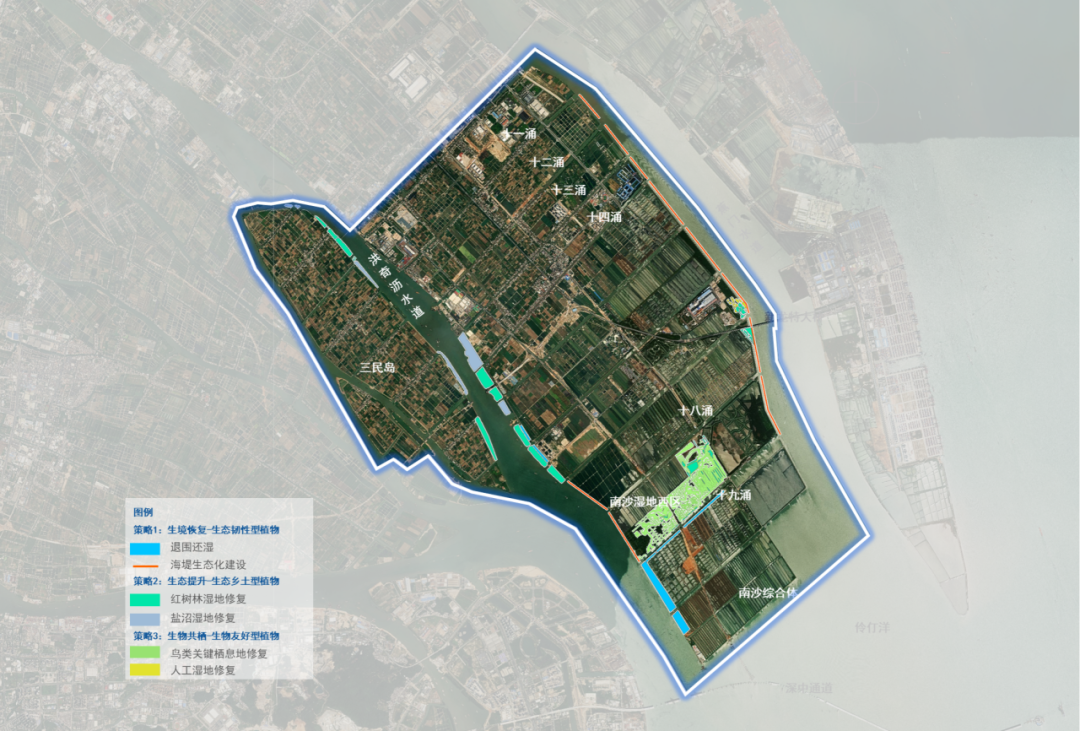为解决河口湿地面积锐减、河口生态系统功能退化、候鸟生存空间不足三大生态问题,基于“植物+生态”,我院设计三种近自然解决方案,旨在优化南沙南部地区生态安全格局,提供更高品质的亲海空间,提高河口生态系统多样性、稳定性、持续性。