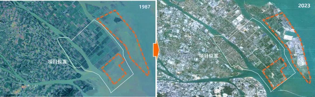 广州南沙南部地区1987年与2023年卫星图对比 图源:自绘