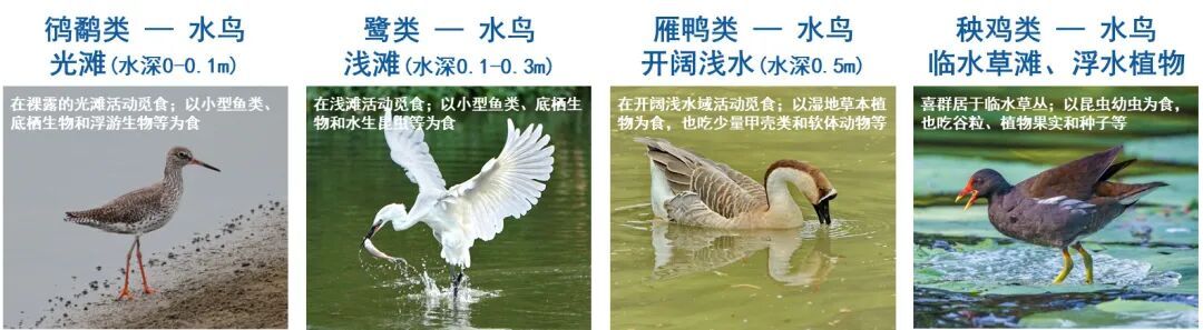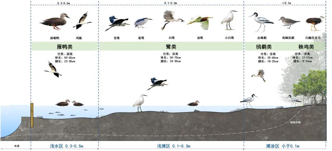 栖息地生境营造:根据鹭类、鸻鹬类、雁鸭类、秧鸡类4种珠江河口代表性鸟类的习性特点,定制深水、浅水、浅滩、滩涂、草甸、灌丛、密林等多种栖息地生境,满足鸟类觅食、停歇、栖息、繁殖、隐蔽等多种需求。