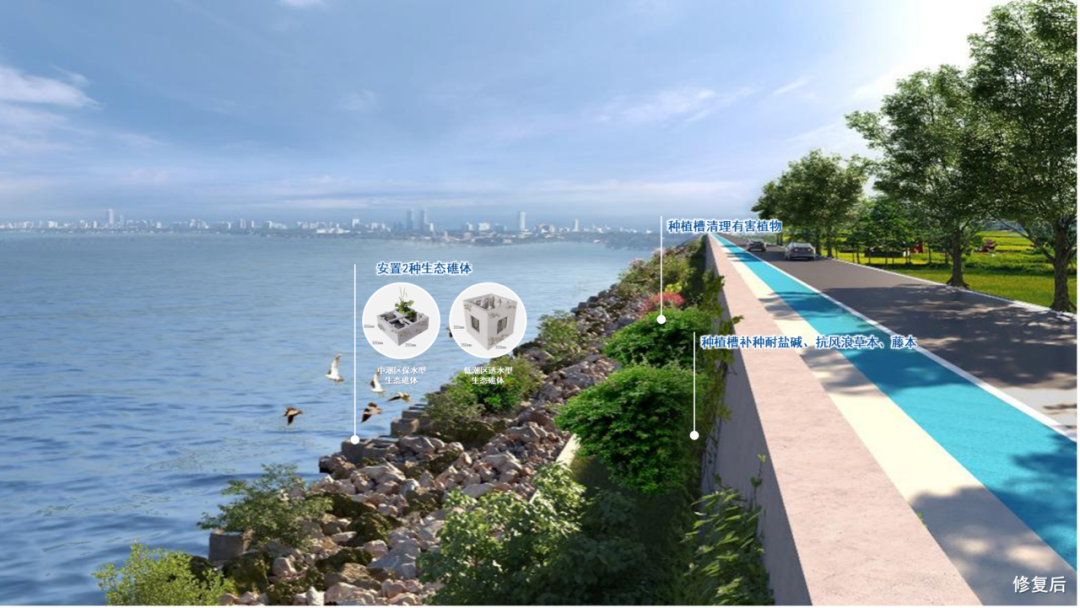 海堤生态化:清除11公里海堤空间上的蟛蜞菊、薇甘菊等有害植物,消除生物入侵威胁;在抛石区安置生态礁体,为植物生长提供稳定基底;进一步补种厚藤、狗牙根、海马齿等耐盐碱抗风浪植物,形成乡土植物主导的潮间带微生境。