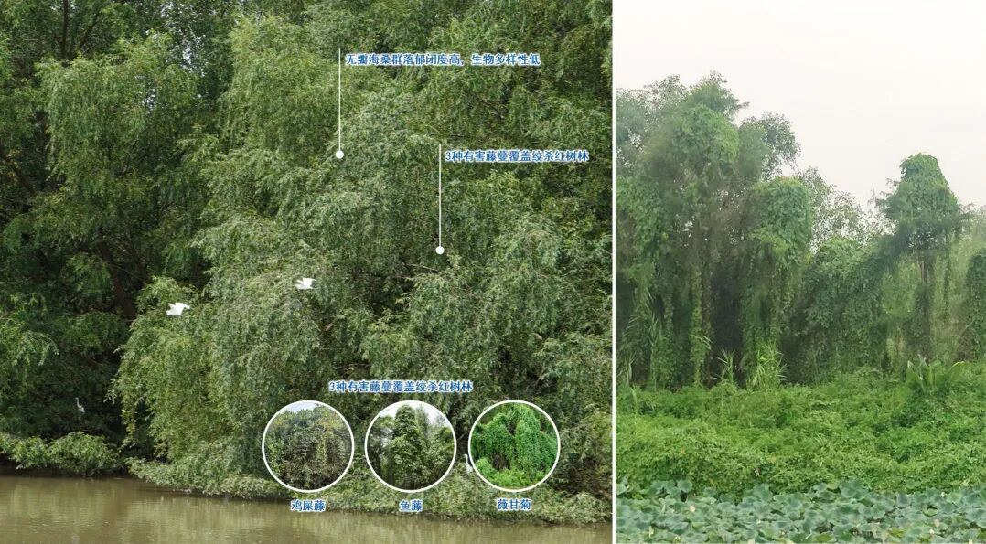 在南沙现有的红树林群落中,无瓣海桑、拉关木等外来红树林群落占红树林总面积95%,林下底栖生物多样性显著低于乡土红树林。同时,大约48种有害生物在“抢地盘”,乡土植物生存空间受到严重挤压。鱼藤、薇甘菊等通过攀缘或覆盖红树植物,争夺光照资源,使被覆盖红树植物的光合作用受到抑制,停止生长甚至枯死。