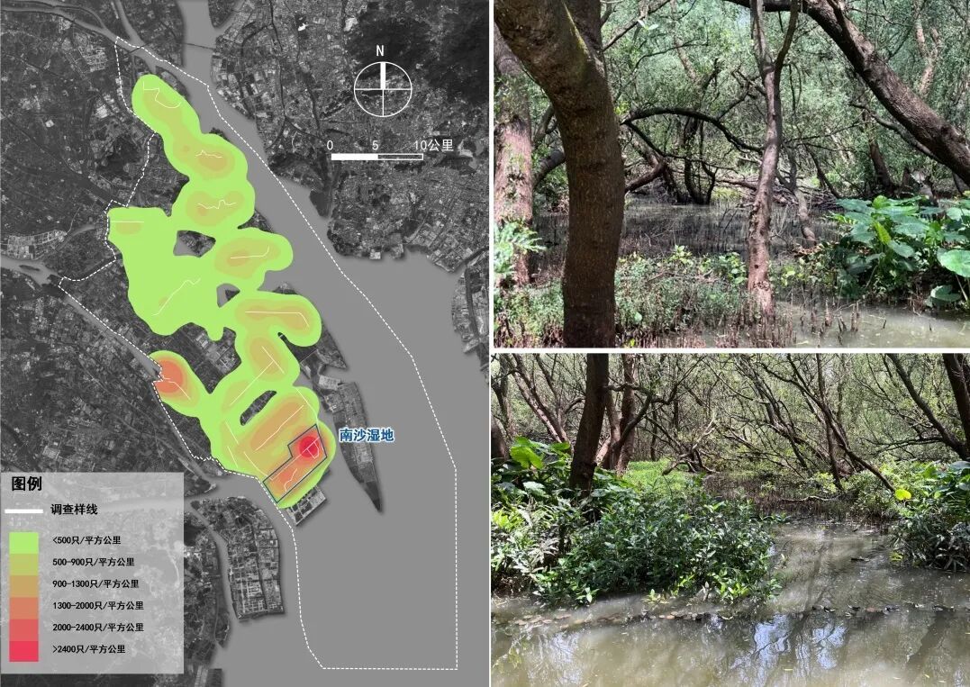 南沙鸟类密度分布图和南沙湿地西区修复前照片 图源:广东省科学院动物研究院