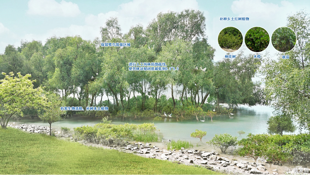 红树林湿地修复:人工清除鱼藤、薇甘菊、鸡屎藤等有害藤蔓植物,拔除地下根茎部分;采用多次修剪方式,清除无瓣海桑低于5m侧枝,使无瓣海桑林冠密度减低至0.3-0.5;综合潮位和盐度特征,林下精准补种桐花树、木榄、秋茄等乡土红树植物,构建层次丰富的乡土红树植物群落,抑制有害生物生长。