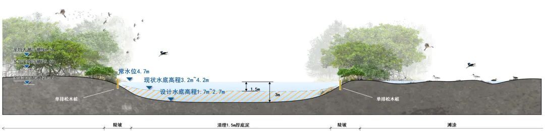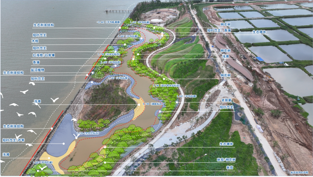 退围还湿:降低现有海堤高程,在养殖塘区域营造“滩涂-浅滩-浅水-深水”的湿地地形,构建“盐沼-红树林-湿地植被-海岸防护林”等多层次海岸植物群落,形成生态减灾协同增效的40公顷海岸湿地,扩大市民亲海空间,同时有效降低波浪爬高,后方生态堤设计高程降低近1米,保障新城安全。