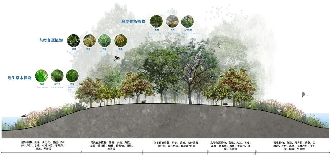 栖息地植物配置:根据鸟类需求,湿地植物选用菖蒲、再力花、慈菇、四叶萍、芦竹、水葱、花叶芦竹、千屈菜、睡莲、野菱等,食源植物选用蒲桃、水翁、黄皮、龙眼、番石榴、杨桃、番荔枝、柑橘、莲雾等岭南特色果树,栖息植物选用构树、苦楝、大叶紫薇、撑杆竹、青皮竹等,营造梯度化植被结构。