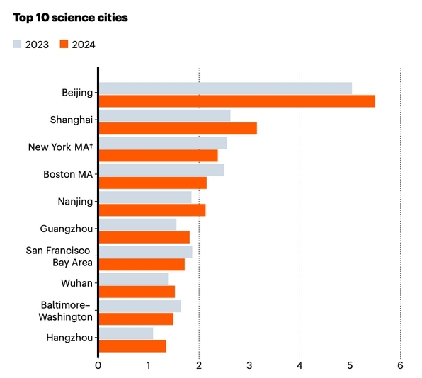 11月16日,施普林格·自然(Springer Nature)发布了《自然》增刊“2025自然指数-科研城市”,聚焦全球主要城市及都市圈2024年在自然指数(Nature Index)追踪的高质量期刊上的最新科研产出变化。中国首次占据全球科研城市十强榜单一半以上席位,由2023年的五席增至2024年的六席。