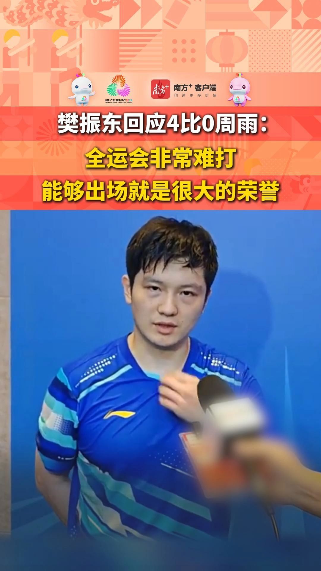 樊振东回应4比0周雨:全运会非常难打,能够出场就是很大的荣誉