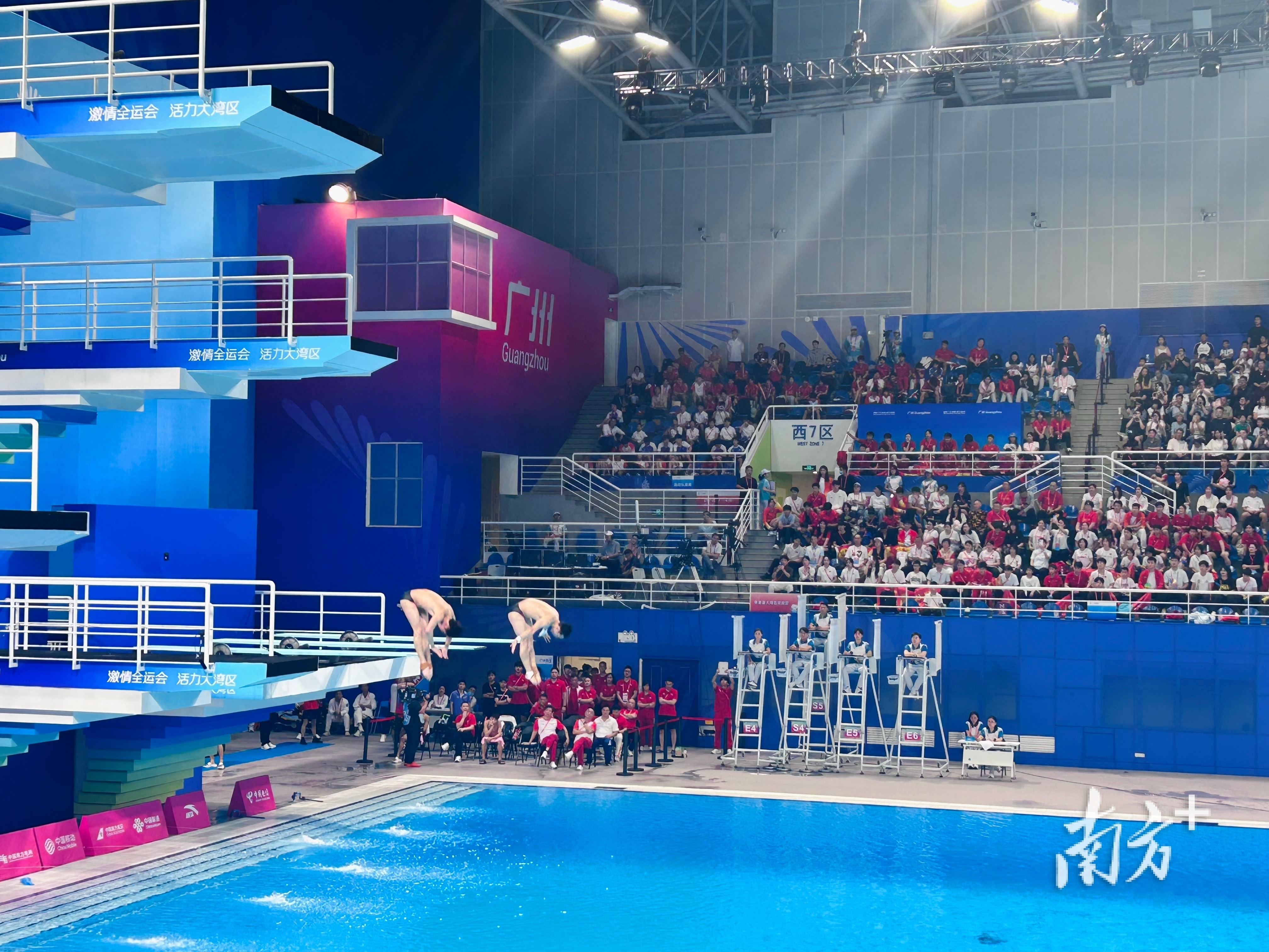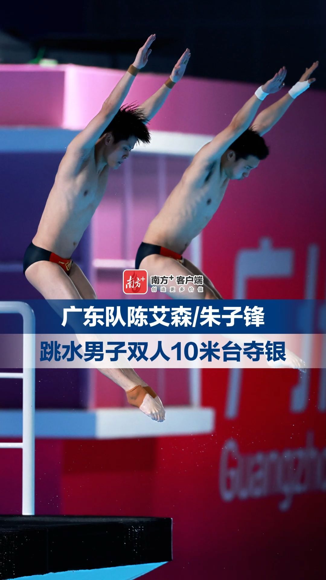 在11月7日晚于广东省奥体中心游泳跳水馆举行的第十五届全运会男子双人10米跳台决赛中,陕西组合白钰鸣/杨昊以总分461.82分夺得金牌,广东组合陈艾森/朱子锋以434.55分获得银牌,天津选手黄子淦/杨凌以411.36分摘得铜牌。作为主场作战的广东队希望,陈艾森/朱子锋在下午的预赛中排名第三。