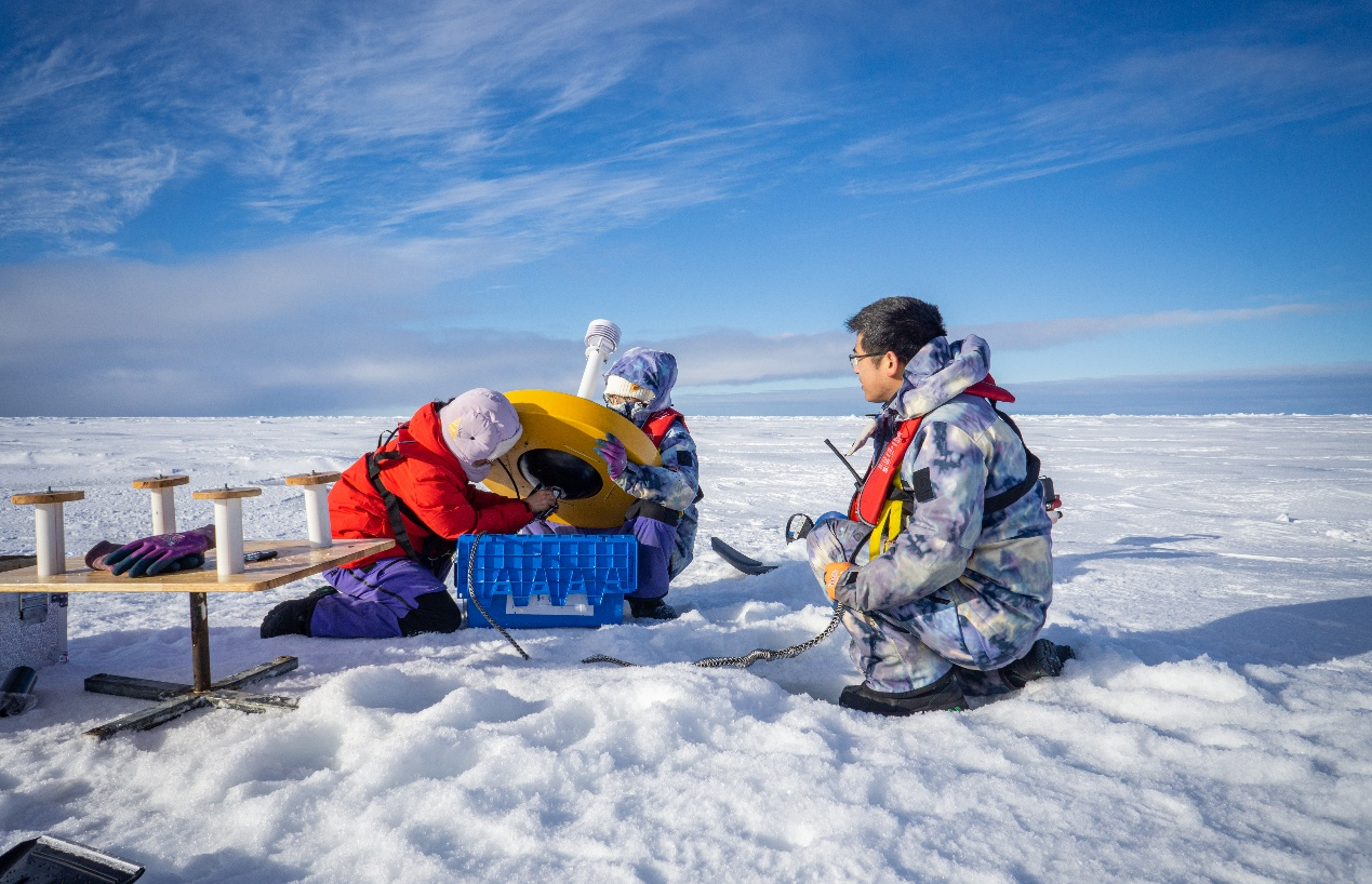 “中山大学极地”号科考船队员在科考过程中布放冰基海洋浮标。中山大学供图