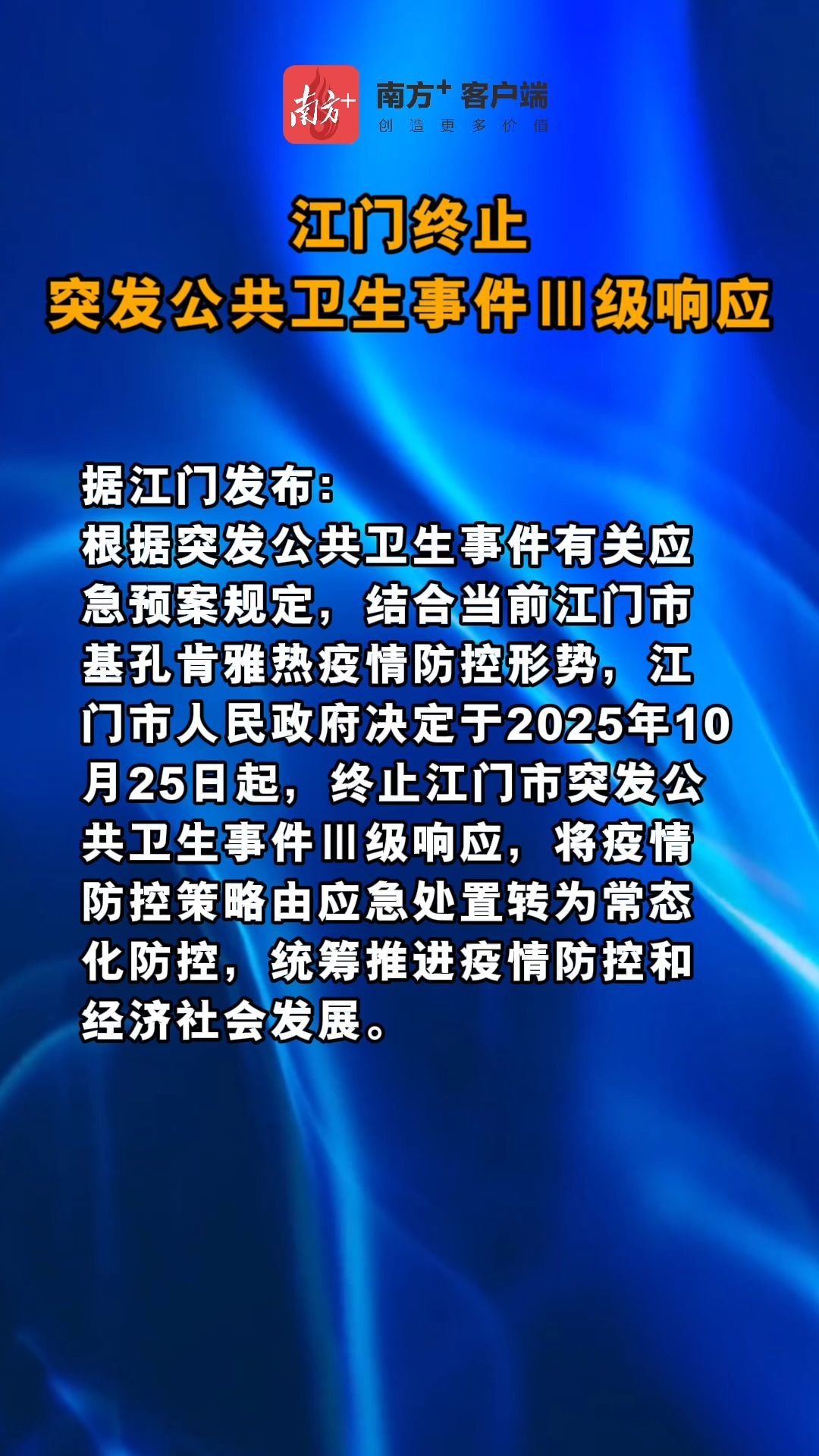 10月25日起,江门终止突发公共卫生事件Ⅲ级响应,将疫情防控策略由应急处置转为常态化防控。详情>>