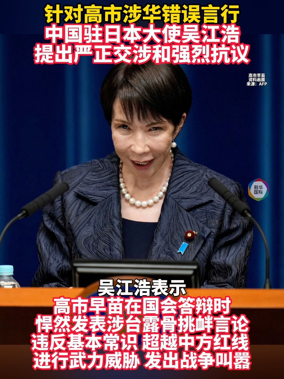 吴江浩表示,日本首相高市早苗在国会答辩时悍然发表涉台露骨挑衅言论,违反基本常识,超越中方红线,进行武力威胁,发出战争叫嚣,且拒不承认错误,拒不收回言论,拒不消除恶劣影响,完全是误判形势、不自量力。有关言论粗暴干涉中国内政,严重违背国际法和国际关系基本准则,严重破坏战后国际秩序,严重违背一个中国原则和中日四个政治文件精神,严重破坏中日关系政治基础。中方对此强烈愤慨、绝不容忍,就此提出严正交涉和强烈抗议。