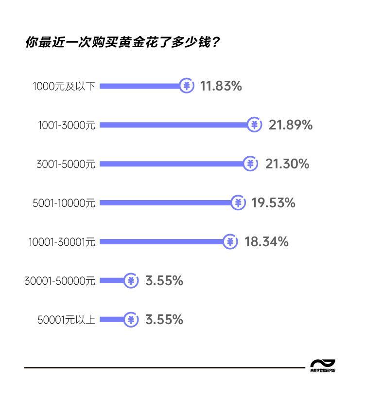 那么年轻人的“购金力”如何?调查数据显示,受访青年最近一次购金消费以小额为主,单次花费在1001元-3000元、3001元-5000元的比例各占两成。总体来看,花费在5000元以内的比例为55.02%。