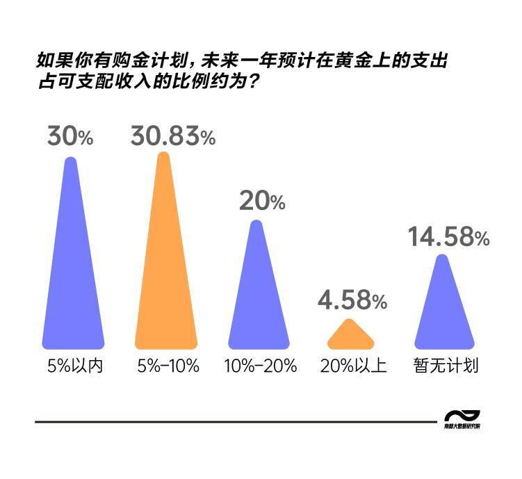 对于未来一年的购金计划,年轻人的规划仍趋向理性。30%的受访青年预计购金支出占可支配收入的5%以内,30.83%的人预计在5%-10%。仅4.58%计划投入20%以上,另有14.58%表示暂无购金计划。