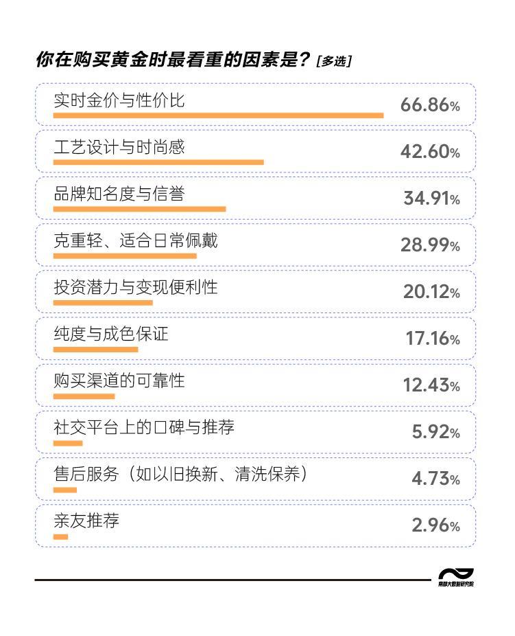 四是渠道信任的“实体回归”。颇具悖论的是,作为互联网原住民的Z世代,在黄金这一高信任成本资产上反而表现出比父辈更强的线下渠道黏性。这揭示了新消费的深层心理:“触感验证”优于“流量种草”。他们虽受小红书、抖音等内容影响,但最终决策仍依赖实体店的工艺体验与品牌背书,体现出在信息过载时代对“真实触感”和“即时确权”的理性回调。