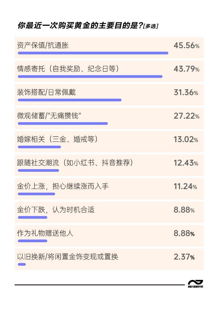 值得注意的是,因婚嫁相关(13.02%)购金的比例并不高,而跟随社交潮流(12.43%)或因金价涨跌而进行的投机性购买(约20%)也非主流。