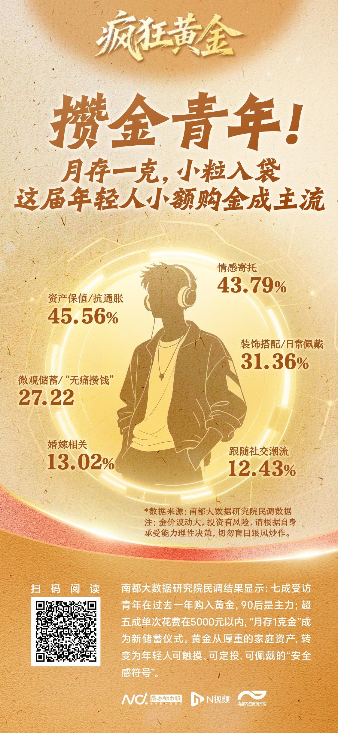 南都大数据研究院于2026年1月发起的问卷调查显示:有七成受访年轻人在过去一年购入黄金,其中90后占主力;超五成单次花费在5000元以内,“月存1克金”成为新储蓄仪式。黄金,正从厚重的家庭资产,转变为年轻人可触摸、可定投、可佩戴的“安全感符号”。