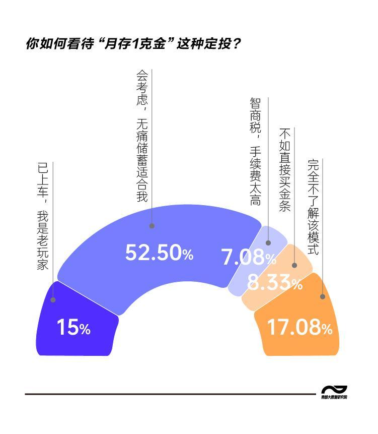 而传统观念中用于保值增值的金条、金砖,在年轻人中热度并不算高,仅占17.75%。与之形成鲜明对比的是,“月存1克金”这种定投模式,更受年轻人青睐,超过一半的受访青年表示“会考虑,无痛储蓄适合我”,另有15%的年轻人已是“老玩家”。
