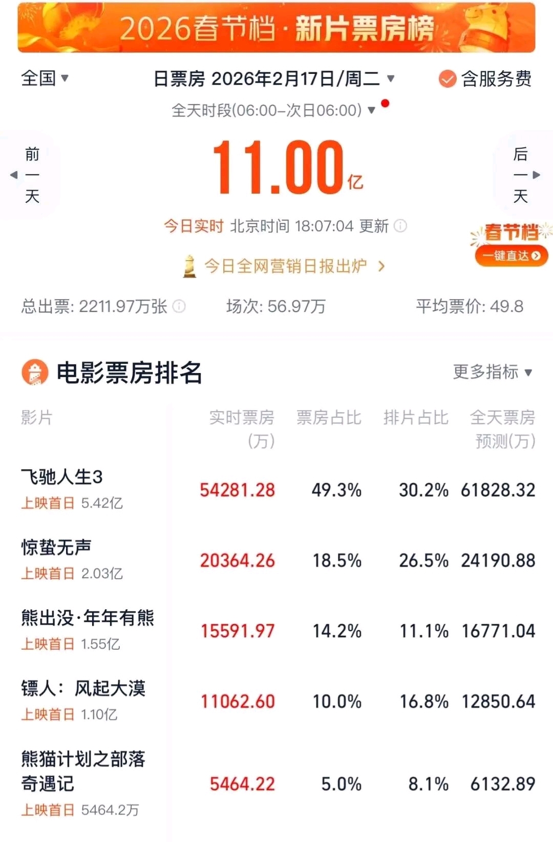 大年初一,由张艺谋执导的春节档电影《惊蛰无声》正式上映。据网络平台数据,截至2月17日11时30分,2026年春节档档期总票房(含预售)已破11亿,这部“深圳出品”的国安题材大片表现抢眼,目前位列春节档票房第二位。