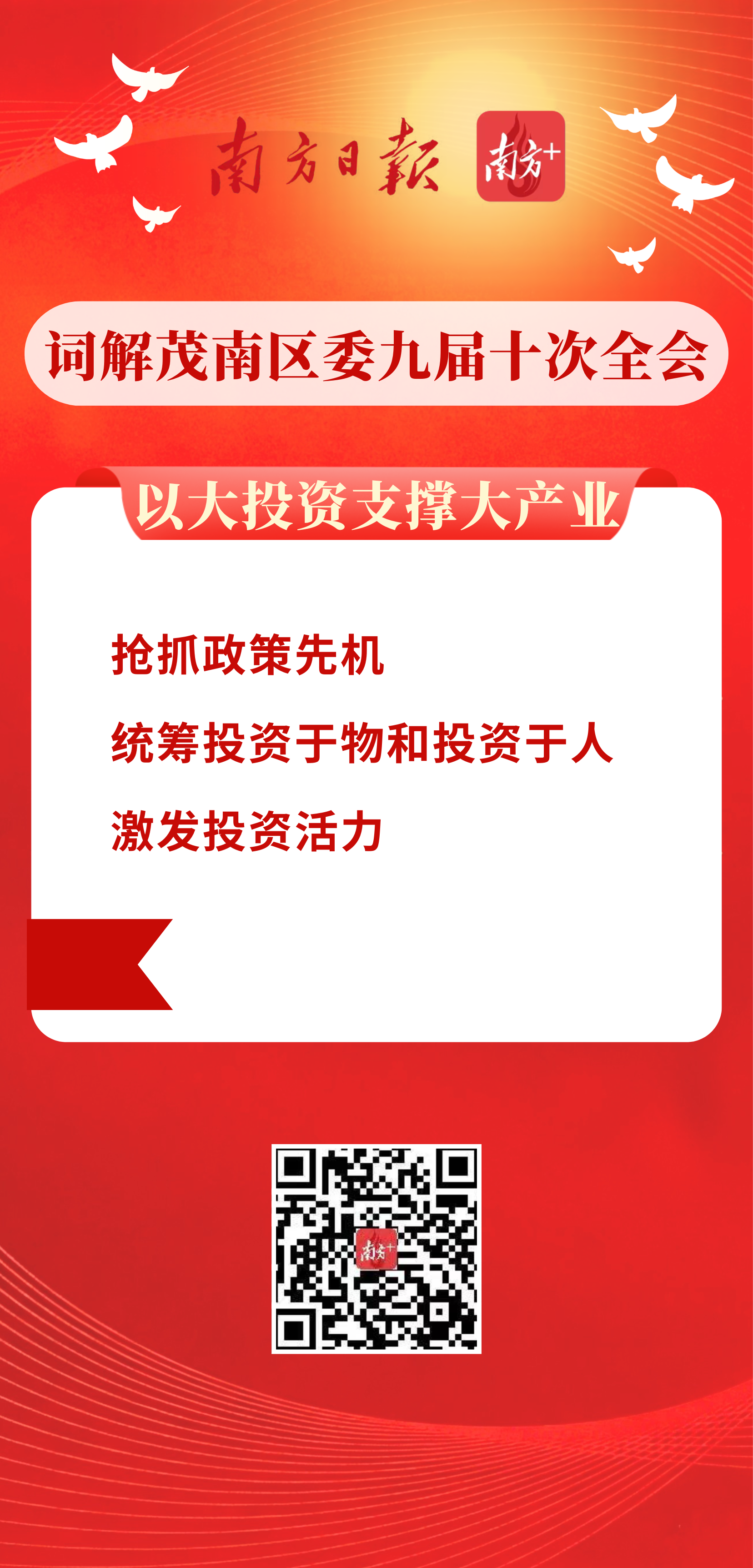解读:茂南将扩大有效投资作为支撑大产业的核心抓手:抢抓“十五五”政策先机,精准谋划储备重大项目;统筹产业项目与社会民生工程投资,加速形成实物工作量;同时激发民间投资活力,强化政企联动与“投债贷”协同,以多元化投资合力构筑高质量发展坚实底座。
