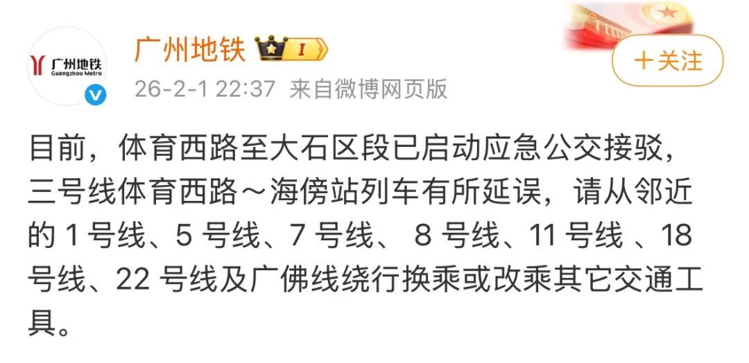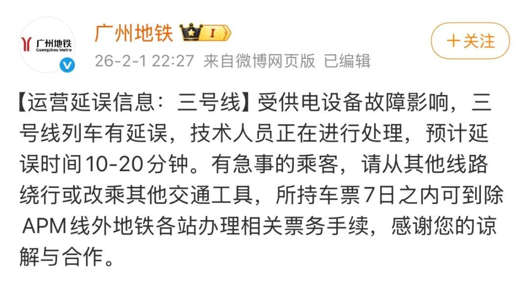 2月1日22时27分,广州地铁发布消息,受供电设备故障影响,三号线列车有延误,技术人员正在进行处理,预计延误时间10-20分钟。