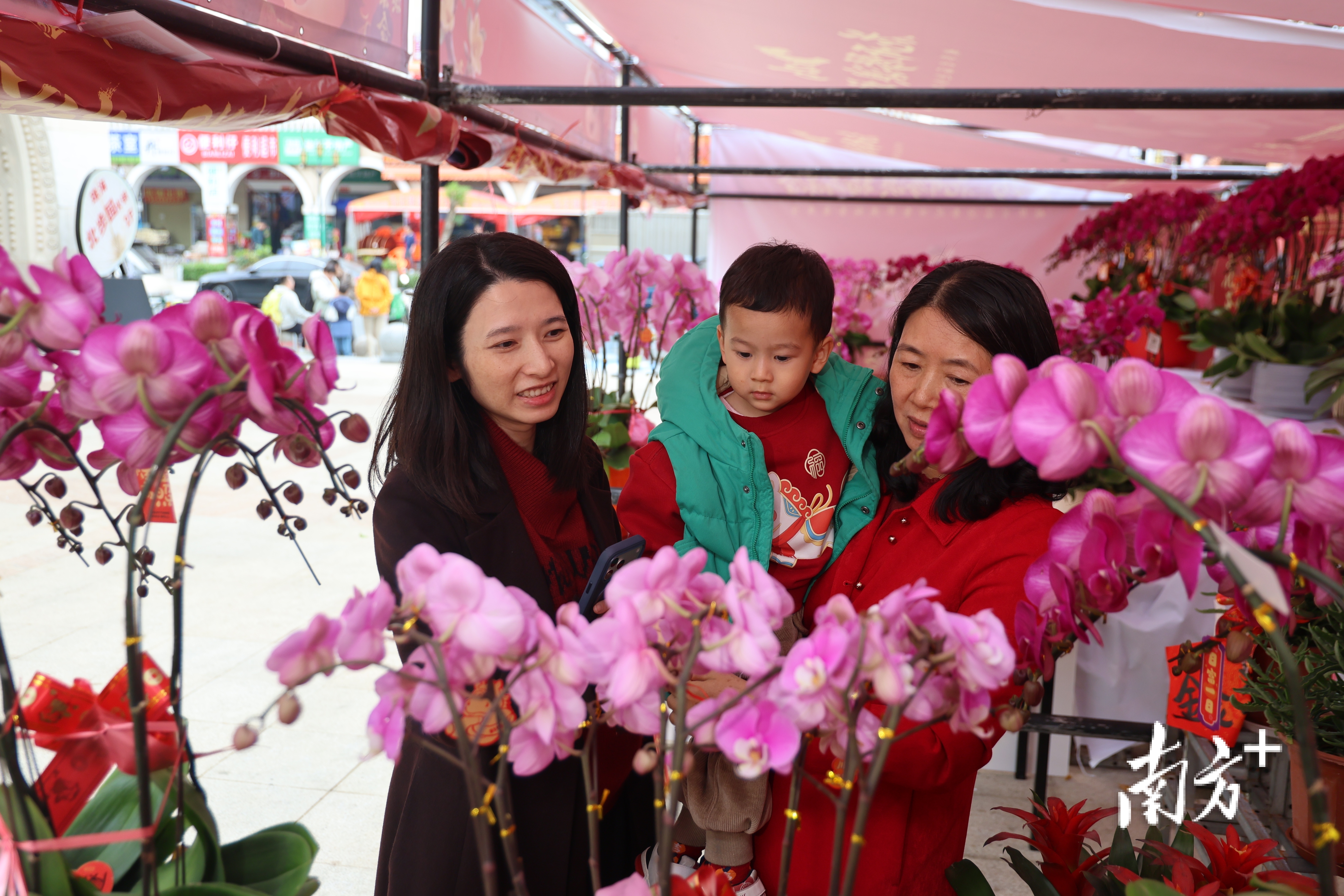 除夕前两天,横琴励骏庞都广场的迎春花市人头攒动。黄茵和丈夫以及两岁半的儿子Lari一起,穿梭花市间,挑选新年年花。小家伙踮起脚尖,伸出小手,去够一盆开得正艳的紫色蝴蝶兰。