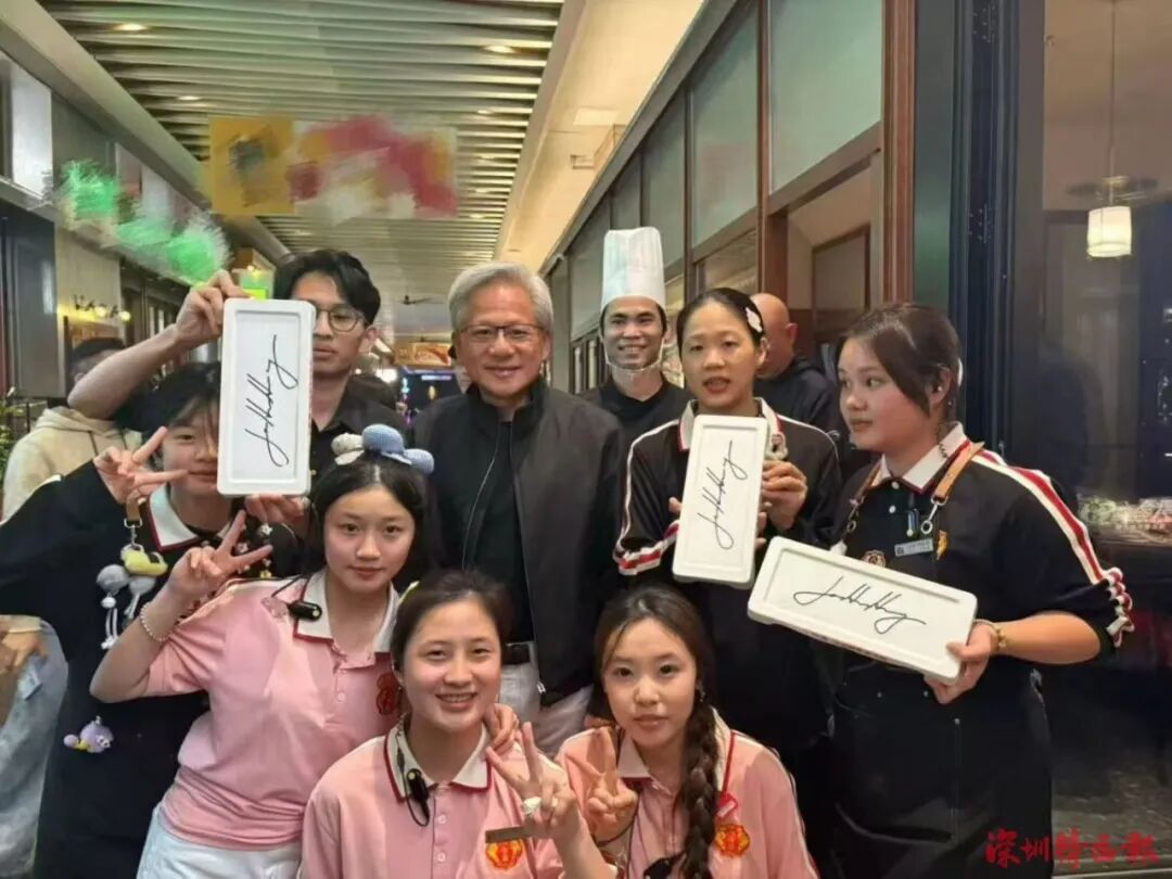 此时,黄银洛与同事们按捺不住,过来请求与黄仁勋合影留念。黄仁勋很痛快地一口答应,还应邀在三个餐盘上签字留念,连声称赞深圳的牛肉既新鲜、又好吃,表示有机会还会再来。