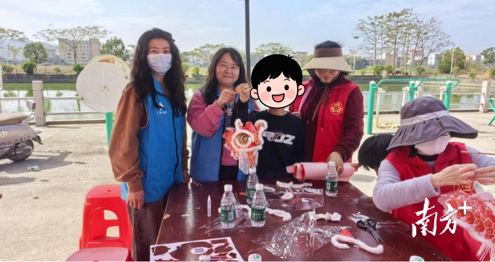 河东镇“双百”社工与儿童服务对象一起制作手工灯笼。
