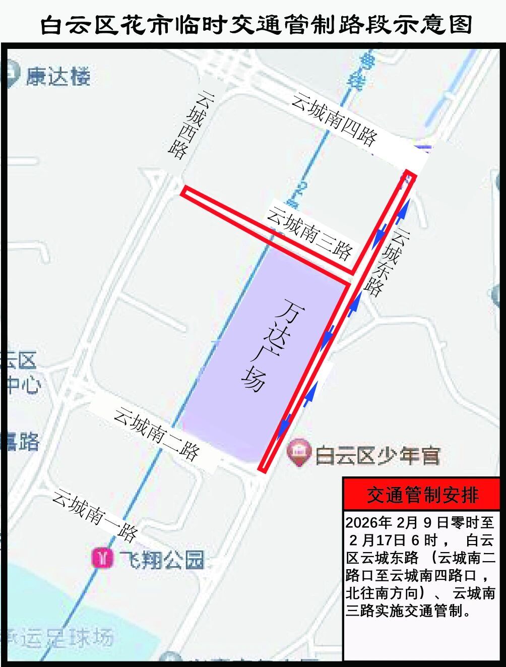 (三)2026年2月9日0时至2月17日6时,白云区云城东路(云城南二路口至云城南四路口,北往南方向)、云城南三路实施交通管制。