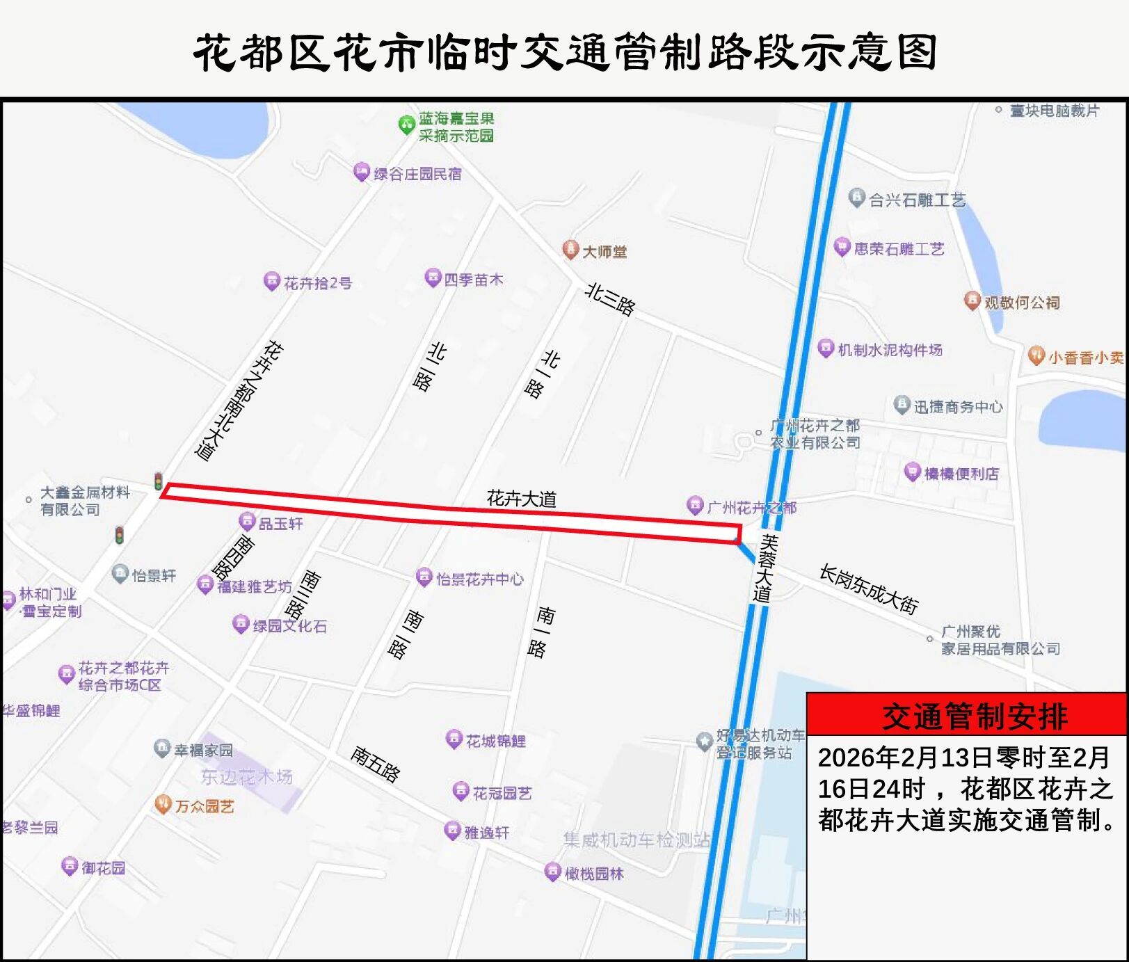 (五)2026年2月13日0时至2月16日24时,花都区花卉之都花卉大道实施交通管制。