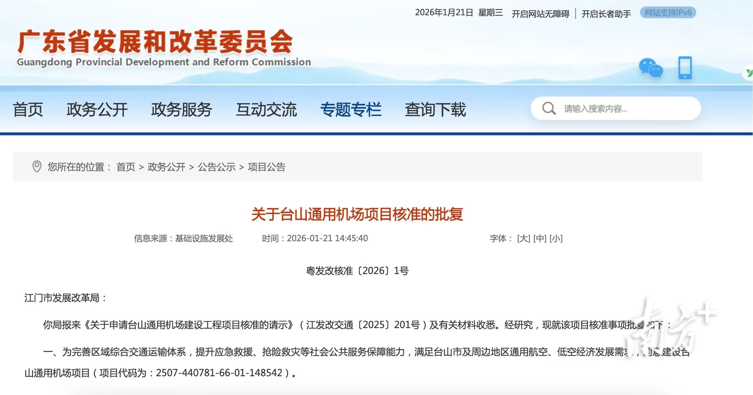 1月21日,广东省发展和改革委员会官网发布《关于台山通用机场项目核准的批复》(下称《批复》),其中提到,为完善区域综合交通运输体系,提升应急救援、抢险救灾等社会公共服务保障能力,满足台山市及周边地区通用航空、低空经济发展需求,同意建设台山通用机场项目,这将是江门的首个机场。