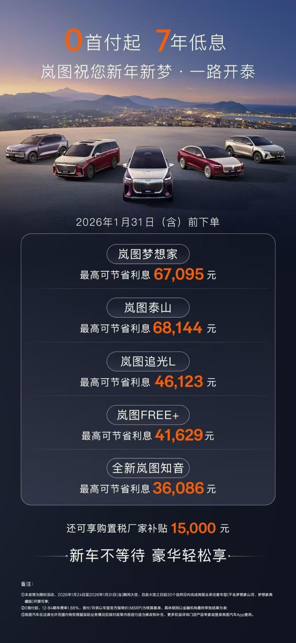 日前,岚图汽车推出“七年低息”购车方案,旗下全系车型在1月24日至1月31日期间完成大定,且30日内开票即可享受0首付、7年低息福利,12-84期年费率低至1.88%,根据车型不同可节省利息3.6万元至6.8万元。