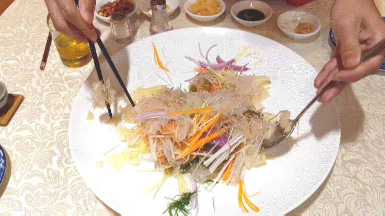 顺德鱼生以厚度仅0.5毫米的透明鱼片,搭配炸芋丝、姜葱丝及花生碎等十余种配料,佐以花生油与盐食用,形成冰凉爽滑的口感。